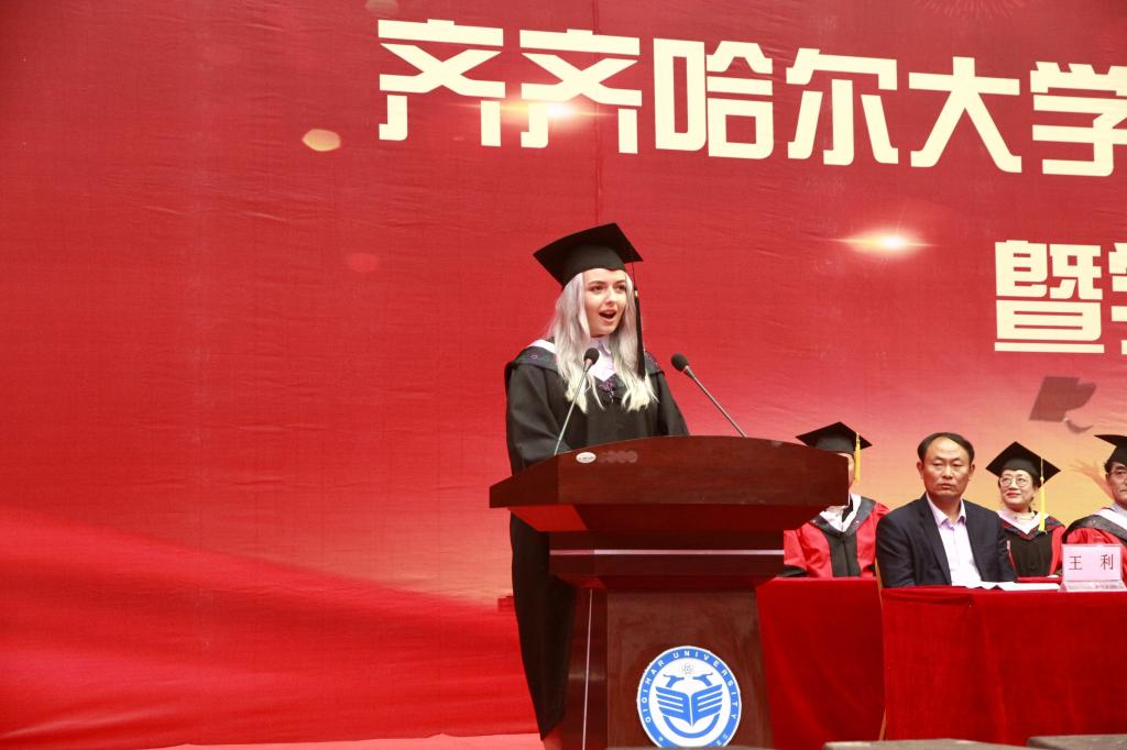 毕业留学生代表奥克萨娜、硕士毕业生代表韩毅初、本科毕业生代表郑祥鹏先后在典礼上发言,他们深情的表达了对母校的感恩和不舍,对老师、同学的感激和祝福,并表示作为齐大学子,一定会秉承“养正毓德 精存自生”的校训精神,积极进取、努力拼搏,用自己的所学所能回馈社会、回报母校。