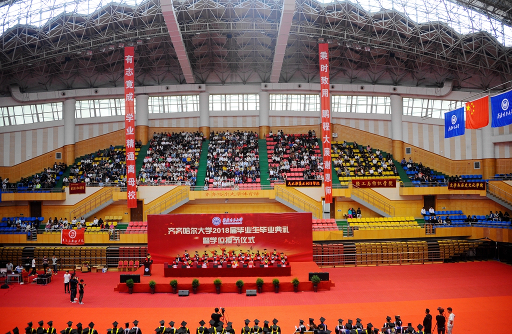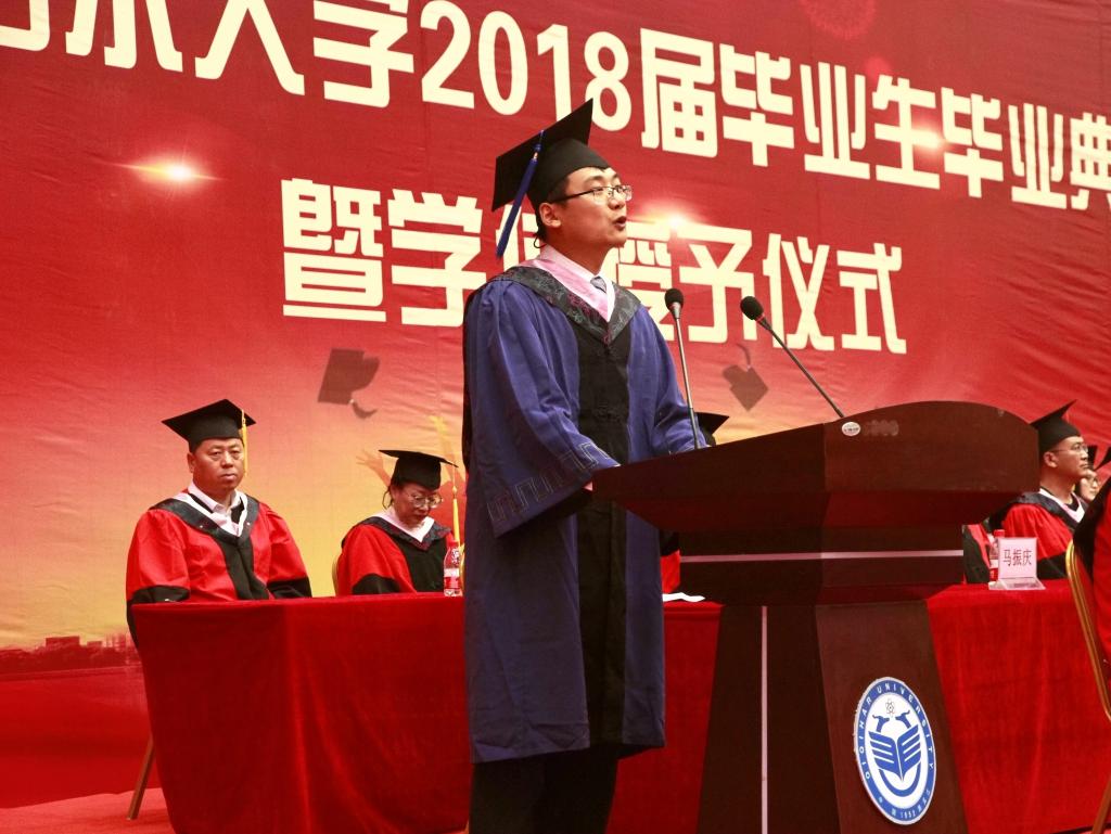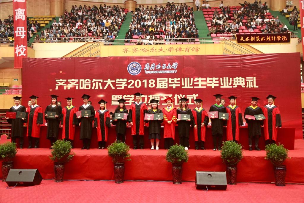 校长陈桂芝在毕业典礼上发表了热情洋溢的讲话,她代表学校对顺利完成学业的毕业生们表示热烈祝贺,向辛勤培育学子的父母、悉心教导学生成长成才的老师表示崇高的敬意和衷心的感谢。她说,你们在校期间,是学校各项事业快速发展的一个时期。2015年,学校登上了全国文明单位的最高荣誉榜,以昂扬向上的精神风貌展示了齐大人的执着与梦想;2016年,学校迎来了“十三五”开门红,国家和省部级科研项目取得了新突破,各项事业都取得了瞩目成绩;2017年,学校圆满完成了教育部本科教学工作审核评估,成功获批“黑龙江省博士学位授权单位立项建设单位”;2018年,学校更是全面启动了“省委巡视整改、审核评估整改、加强作风整顿、新增博士学位授权立项建设单位”等各项综合改革任务,开启了写好奋进之笔的齐大新篇章。你们是这些变化的见证者、亲历者,也是创造者。在我们共同经历学校改革与发展的同时,同学们也完成了人生的蜕变。你们用勤奋的汗水耕耘理想,不负青春韶华,不负家人重望,在大学时代留下了一个个不可磨灭的印记,为学校赢得了荣誉。在此,我要向大家道一声感谢,感谢你们这些年来对学校事业发展的支持和贡献,更特别感谢你们,对学校管理服务中出现的不足、不周、不尽人意之处给予的理解和包容。