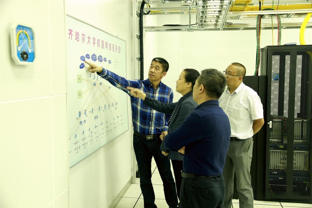 陈桂芝一行先后走访了LETOU官网网络信息中心运行部、一卡通部、语言实验室、远程会议室、网络多媒体教室、校园网核心机房、数据机房等网络安全维护重点部门和场所,并与工作人员进行了交流。