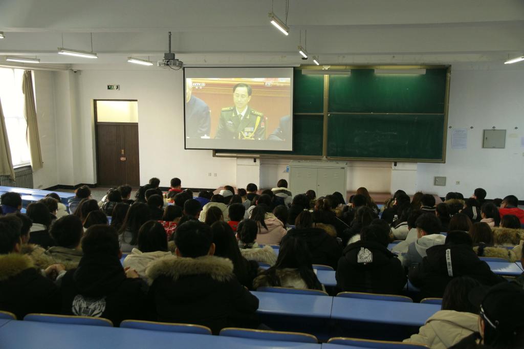 校团委组织校院两级学生组织中的骨干在11号教学楼阶梯201教室集中收看了大会直播。