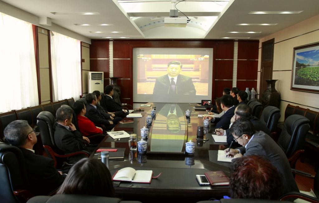 校党委理论学习中心组成员在办公楼504会议室全程收看了大会直播。