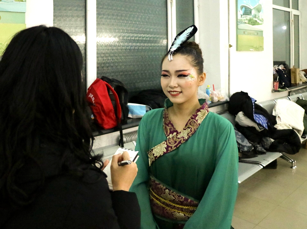 大学生记者团的学生记者采访到了《半壶惊鸿舞盛世》的领舞、校博乐古典舞蹈与器乐协会会长于文浩,她说:“我们协会新成立不久,参与的演出不多,非常高兴能参与这次研究生迎新文艺演出活动,希望通过我们的表演让同学们欣赏到古典舞之美,也希望以后能有更多的机会给大家演出。”