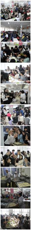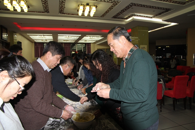 食堂的师傅们早早就为师生们准备好了包饺子的材料和用具。校、处领导与师生们捋起衣袖,洗手包饺子,有的揉面,有的擀皮,有的在包,有的在学。大家一边包饺子一边交流着各自家乡庆元旦的各种习俗。北方同学包的饺子个大饱满,南方同学包的饺子则小巧精致,有的同学用手机上网找来了包饺子教程,一边看一边学,包出了形态各异的饺子,有的像蝴蝶、有的像花朵,不时引发一阵阵笑声。