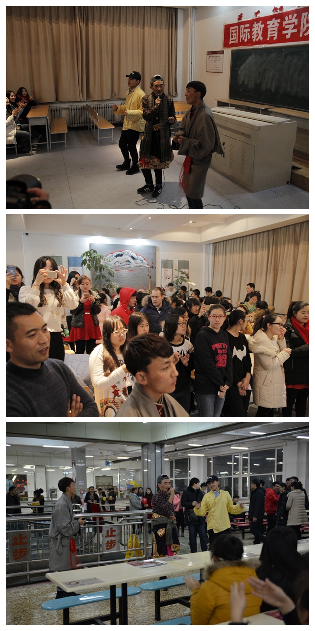 师生包饺子过新年活动中,网络人气爆棚的“快闪哥”、藏族学生普达杰等“快闪团”同学们在包饺子食堂现场为同学们献歌,同学们一起载歌载舞、互道吉祥,喜迎新年,十足的“文艺范”赢得了同学们热烈的掌声与叫好声,集体过年的“年味”更浓了。