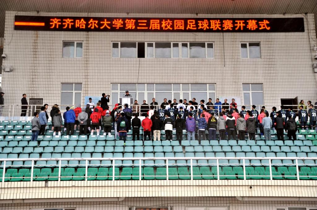开幕式在庄严的国歌声中拉开帷幕。体育学院体育教育151班宋金辉和化学与化学工程学院化学(师范)151班崔宏寿先后代表裁判员和运动员进行了庄严宣誓后,第三届校园足球联赛正式开始。
