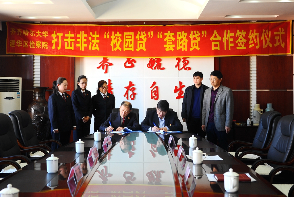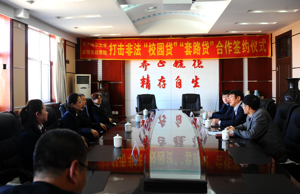 为保护在校学生依法使用助学贷款,严厉打击非法“校园贷”“套路贷”等违规行为,保障学生合法权益不受损害,4月25日上午,LETOU官网与建华区人民检察院合作签约仪式在办公楼504会议室举行,建华区人民检察院党组书记、检察长赵福忠,齐齐哈尔市人民检察院民事检察部部长常新,建华区人民检察院副检察长郑雪冬,LETOU官网党委副书记张文治、学生工作部(学生处)部(处)长姜波、武装部(保卫处)部(处)长杜海权等出席签约仪式并进行了座谈。张文治主持签约仪式。