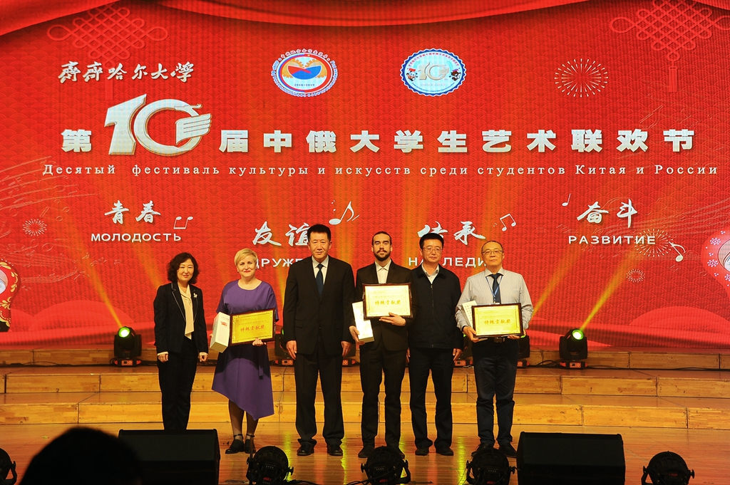 与会领导和嘉宾为两国院校颁发中俄大学生艺术联欢节特别贡献奖