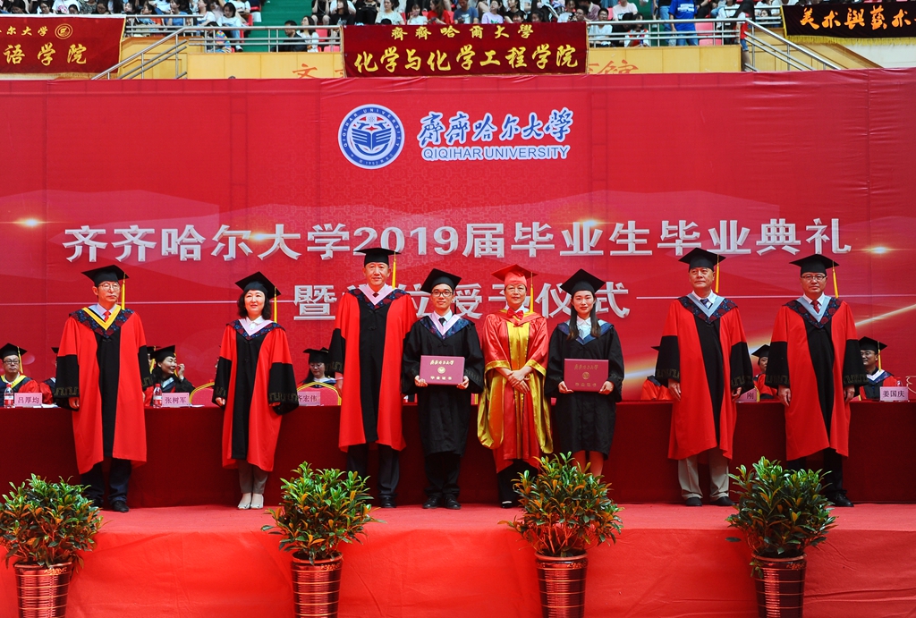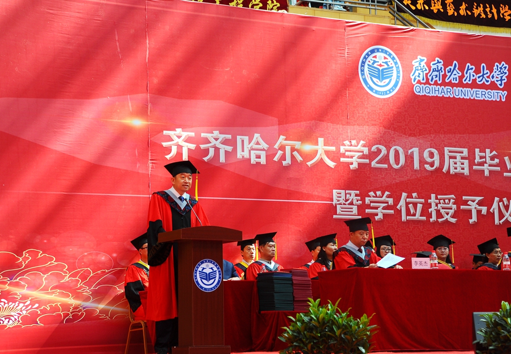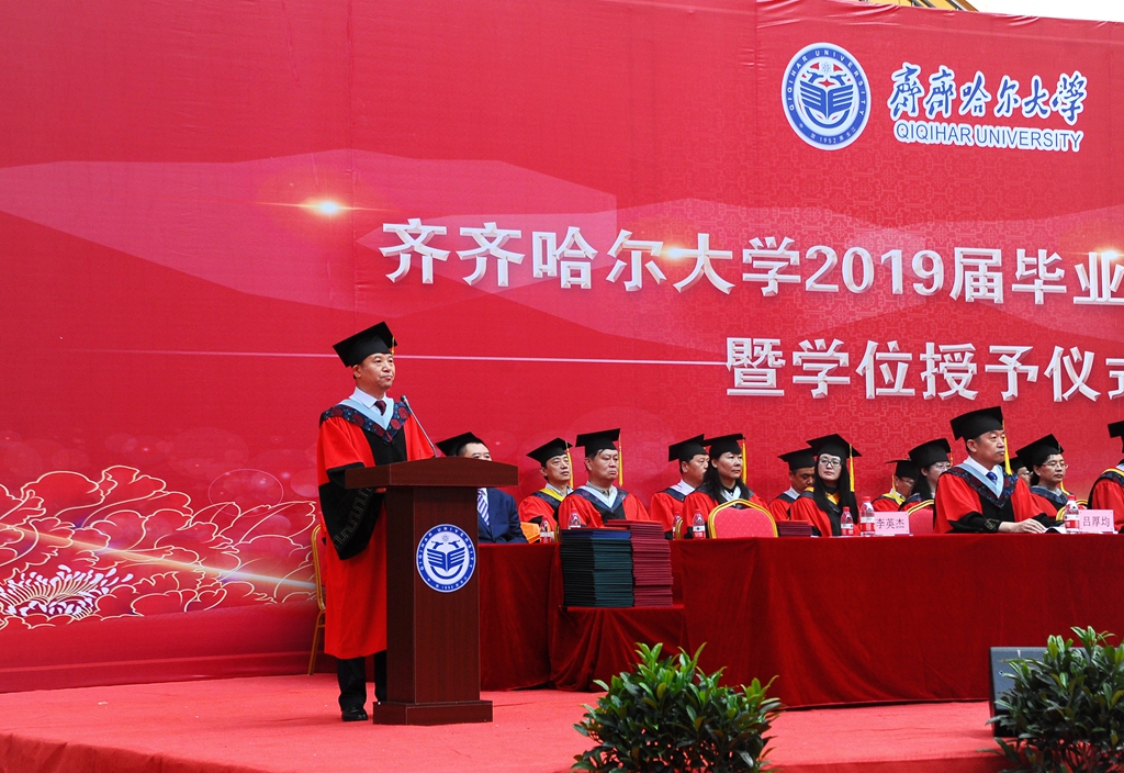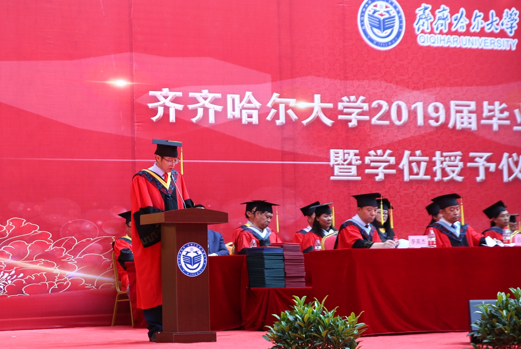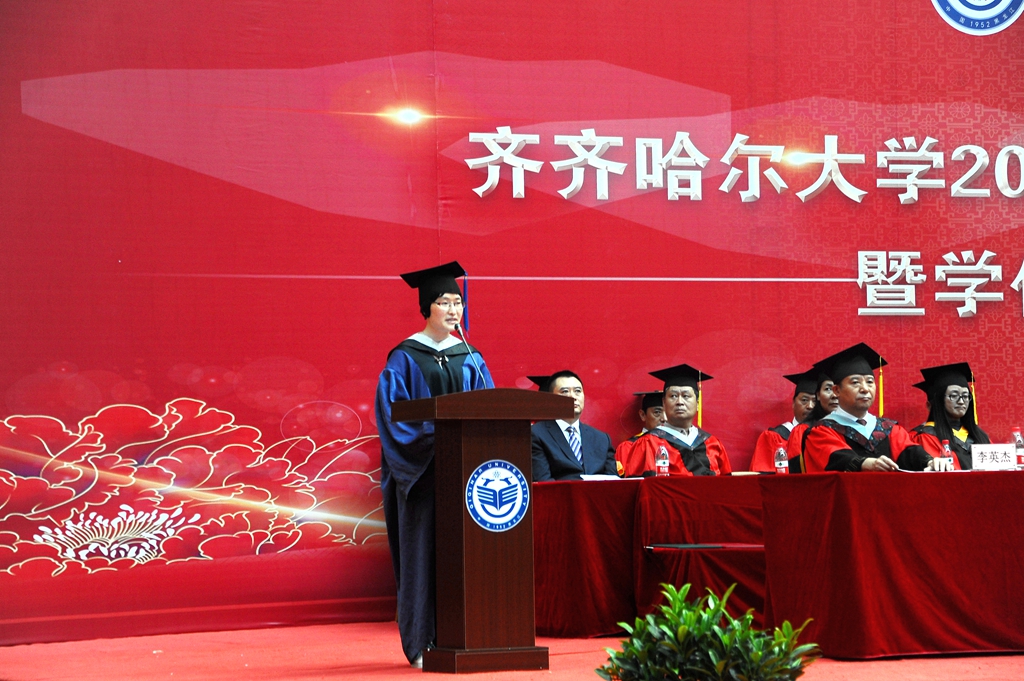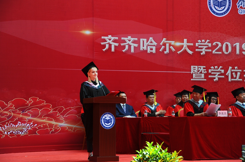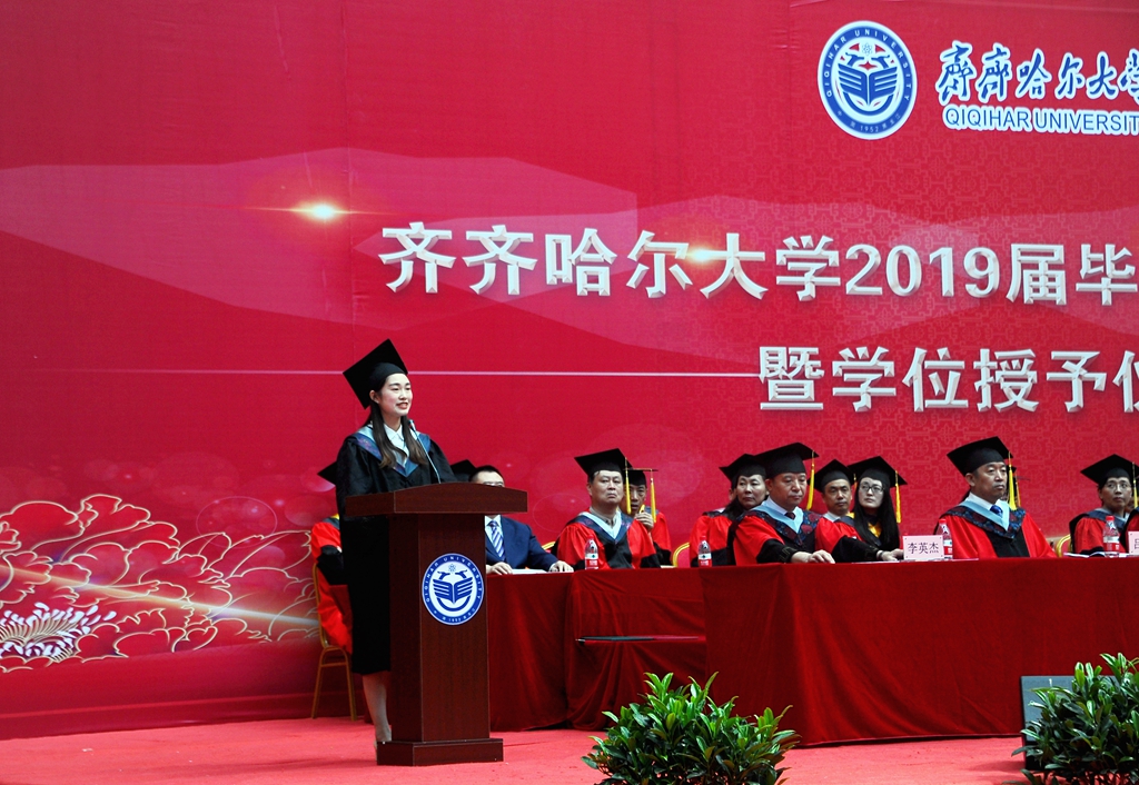 毕业留学生代表卡佳、硕士毕业生代表陈文晶、本科毕业生代表高丽先后在典礼上发言,他们深情地表达了对母校的感恩和不舍,对老师、同学的感激和祝福,并表示,作为齐大学子,一定会秉承“养正毓德 精存自生”的校训精神,积极进取、努力拼搏,用自己的所学所能回馈社会、回报母校。