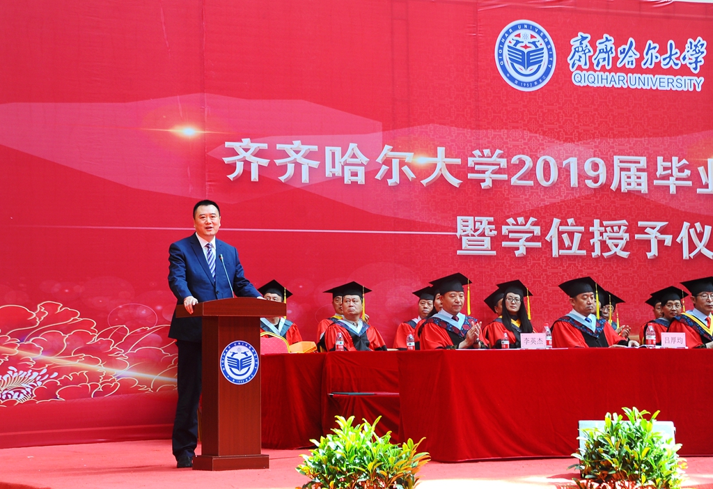 校友代表、安徽古井贡酒有限公司常务副总经理闫立军在典礼上发表讲话,他代表全体校友向母校表达了感恩之情,感谢母校的培养和教育。他说,“因为有了母校齐大的学习经历,不仅仅让我掌握了扎实的理论功底,更为重要的是还培养了我如何做人,如何做一名对国家和社会有贡献的人,才有了我今天的成长和成就。在此,我要向母校,向各位老师,再一次表达我由衷的感谢,谢谢母校,谢谢老师们!”同时,他还向即将走向社会的学弟学妹们表示热烈的祝贺和深深的祝福,祝贺大家圆满出色完成学业,祝福大家走向社会后的明天更美好,更精彩!