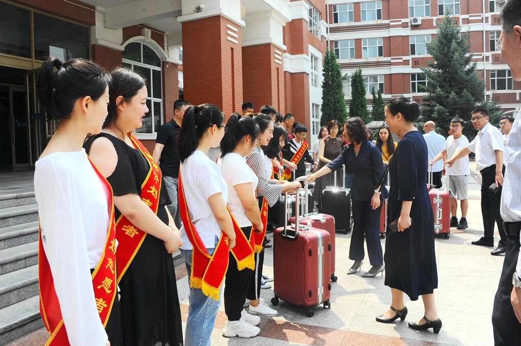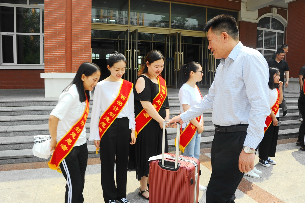 欢送仪式结束后,与会的领导、老师一同为2019年西部计划大学生志愿者披挂绶带、赠予箱包并合影留念。