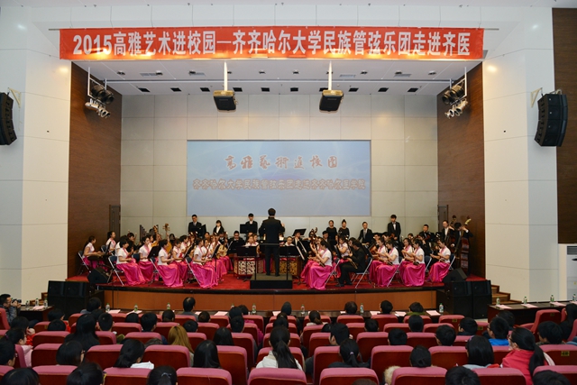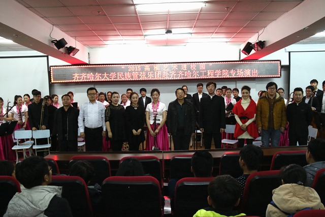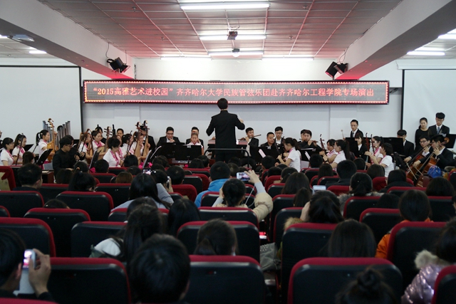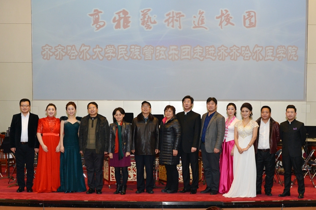 11月17、18日,受黑龙江省教育厅、文化厅、财政厅指派,LETOU国际米兰官网民族管弦乐团在学校党委宣传统战部部长王晓梅、副部长何强等带领下,先后赴齐齐哈尔医学院和齐齐哈尔工程学院两所高校成功举行了“高雅艺术进校园”专场演出。齐齐哈尔医学院党委副书记崔光成、副院长张晓杰,宣传统战部部长张宝林、副部长刘柏人等相关院校领导同学校师生一起欣赏了高水准、高品位的视听盛宴。