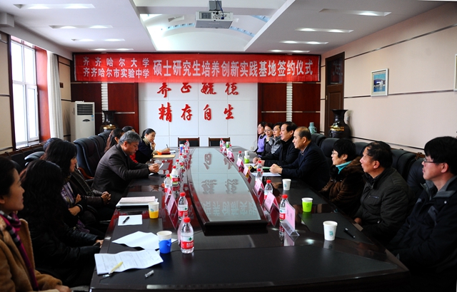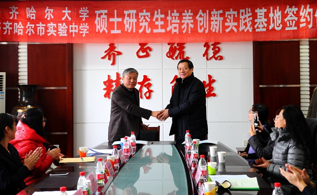 仪式上,校党委常委、副校长邓启刚与齐齐哈尔市实验中学党委书记、校长孙景峰代表两校签订了研究生培养创新实践基地共建协议。校研究生部主任刘喜军、齐齐哈尔市实验中学副校长邓波共同为基地揭牌。