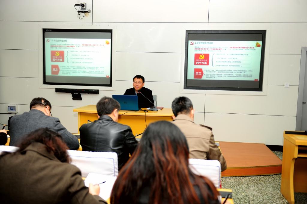 10月30日下午,校党委副书记齐宏伟在办公楼519会议室为分管部门党员干部讲专题党课。学校办公室联合党支部、宣传部-统战部联合党支部、人事处党支部全体党员参加了专题党课学习。齐宏伟以《强化理论武装滋养初心引领使命坚持用习近平新时代中国特色社会主义思想武装全党》为题,对大家关心的如何认识用习近平新时代中国特色社会主义思想武装全党的重大意义,如何把握习近平新时代中国特色社会主义思想的精髓,如何学深悟透习近平新时代中国特色社会主义思想等问题进行了深入的讲解。齐宏伟要求分管部门党员领导干部,要学深悟透习近平新时代中国特色社会主义思想,将其转化为推进学校改革发展稳定和党的建设各项工作的实际行动,把初心使命变成党员干部锐意进取、开拓创新的精气神和埋头苦干、真抓实干的自觉行动;在开展主题教育中要带好头、作表率、树标杆,严格落实主题教育的各项安排,在理论学习上带好头、在调查研究上带好头、在检视问题上带好头、在整改落实上带好头,确保主题教育取得实效。