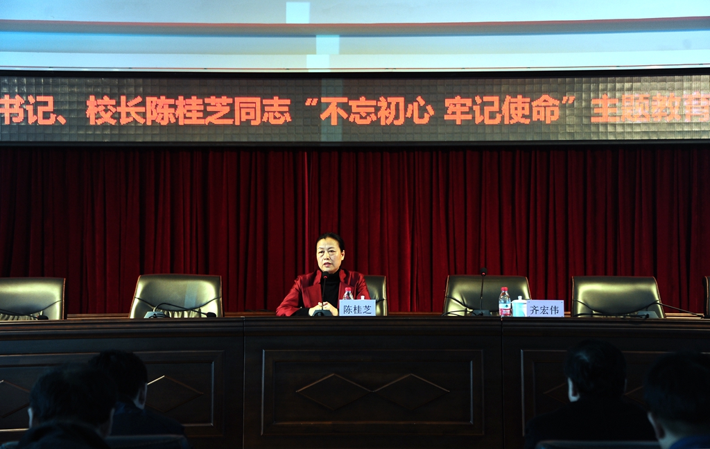 专题党课上,陈桂芝从重温习近平总书记关于“不忘初心、牢记使命”的重要论述入题,紧扣主题主线,层次分明地阐述了“什么是‘不忘初心、牢记使命’”、“为什么要‘不忘初心、牢记使命’”、“践行初心使命,奋力推动学校高质量发展”等三方面内容,阐明“不忘初心、牢记使命”是坚持党的性质、践行党的宗旨的政治自觉,是从历史汲取前进力量、永葆青春的政治动力,是中国共产党自我革命的政治建设,是实现党的历史任务的政治追求。陈桂芝紧扣立德树人根本任务,坚持问题导向,紧密联系学校实际,紧密结合调研课题,对学校推进内涵式发展建设面临的矛盾问题,提出了有针对性的整改思路和举措。
