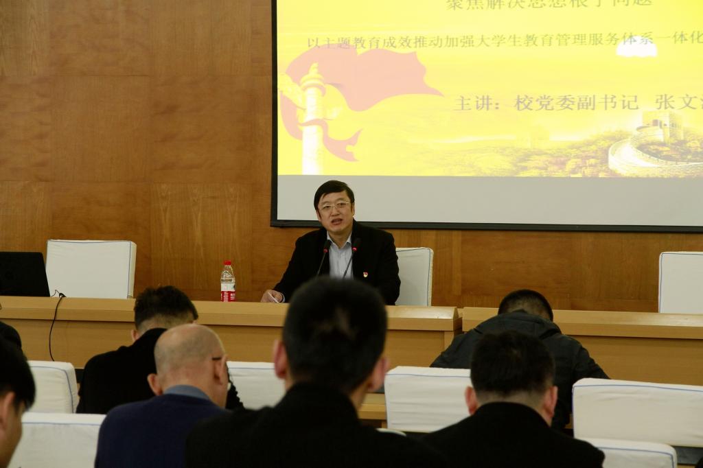 10月29日下午,学校党委副书记张文治在西主学术报告厅,以《聚焦解决思想根子问题 以主题教育成效推动加强大学生教育管理服务体系一体化构建取得实效》为题,为分管部门和联系单位的党员干部讲专题党课。他从坚持以思想教育打头、聚焦解决思想根子问题,坚持教育报国守初心、立德树人担使命,坚持对表对标初心使命、深入查找差距不足,坚持发挥好学指委职能、推进构建大学生教育管理服务体系一体化育人格局等四个方面,结合个人参加主题教育的收获,阐述了对“守初心、担使命”的感悟。张文治希望分管部门和联系单位的党员干部,严格按照中央、省委的部署要求和学校党委的工作安排,扎实推进主题教育,抢抓机遇、勇于担当,凝神聚力、奋发有为,全面提高学生工作整体水平;按照“守初心、担使命、找差距、抓落实”的总要求,奋力谱写新时代学校学生工作发展改革新篇章,为建设有特色地方高水平应用型综合大学作出新的更大贡献!