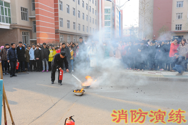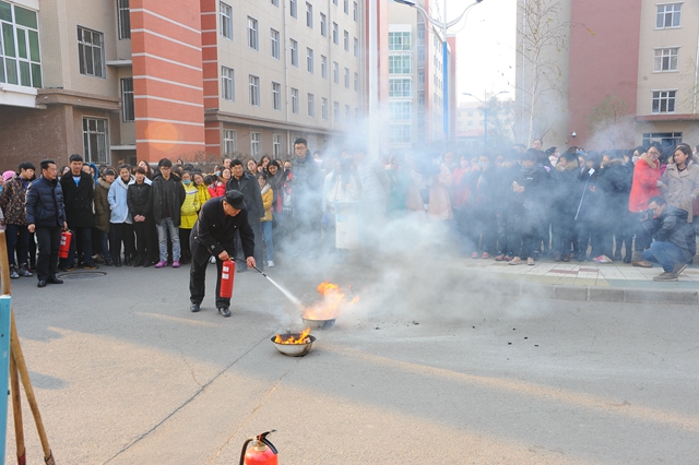 保卫处梁力强老师为学生现场演示消防器材的使用,并邀请十几名学生动手实践,使用灭火器灭火。