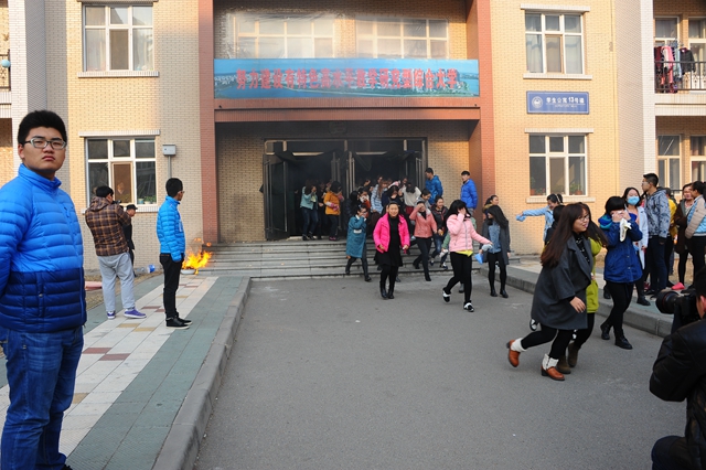 为不断增强广大师生的消防安全意识,提高学生应急自救能力,切实贯彻落实校安委会《关于做好2015年冬季消防安全工作的通知》精神,按照第二届学生寝室节方案要求,11月11日13时,学生处联合保卫处在13号学生公寓楼门前举行了消防安全演练活动。保卫处处长吴刚、副处长刘增发、防火科科长夏忠臣、梁力强老师,学生工作部处长姜波、副处长张树启,学生工作部舍务管理科全体成员,理学院、轻工与纺织学院、化学与化学工程学院主管学生工作的副书记、副院长、学工办主任、舍管会学生干部等1000多人现场参与了此次演练。