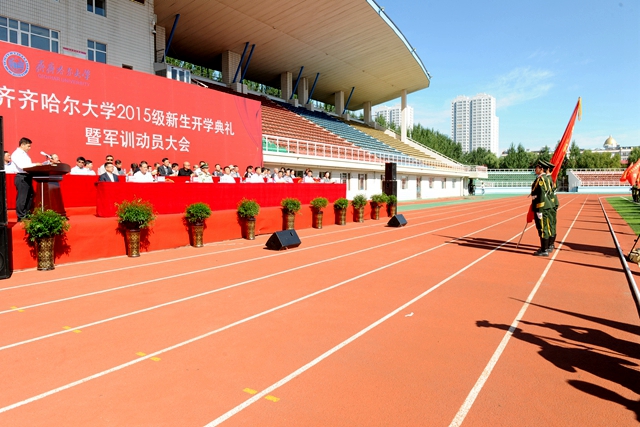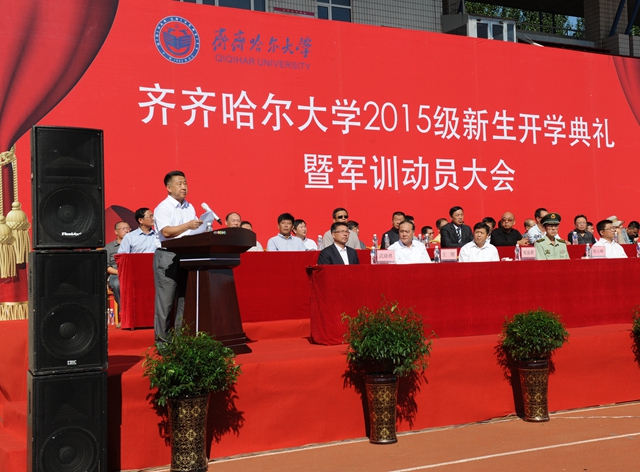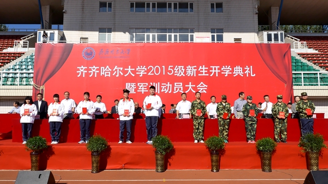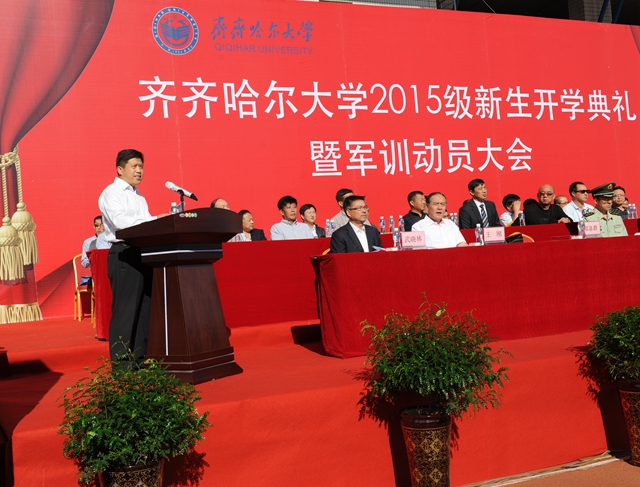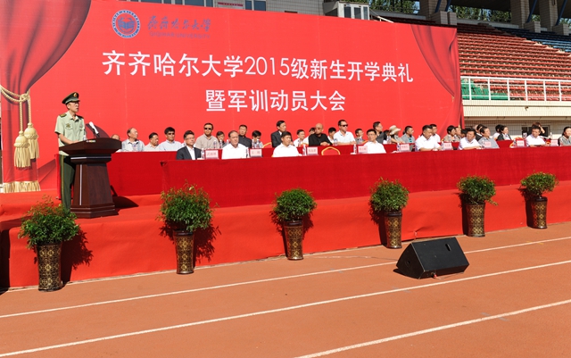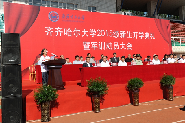 校党委书记李海红,校长马立群同志,校党委副书记盖元臣,常务副校长郑喜群,副校长邓启刚、王刚、李英杰,党委常委、组织部部长齐宏伟,承训部队首长、武警齐齐哈尔支队副参谋长矫占峰中校,特邀嘉宾,LETOU官网优秀校友代表、工业分析专业八八届毕业生、大庆油田勘探开发研究院总工程师、北京奥运会火炬手、全国“五一”劳动奖章获得者、全国劳动模范伍晓林等出席典礼并在主席台前排就坐。各学院院长、党委书记、军训团组成单位领导,来自全国各地的2015级新同学(本科生、研究生)参加了开学典礼。
