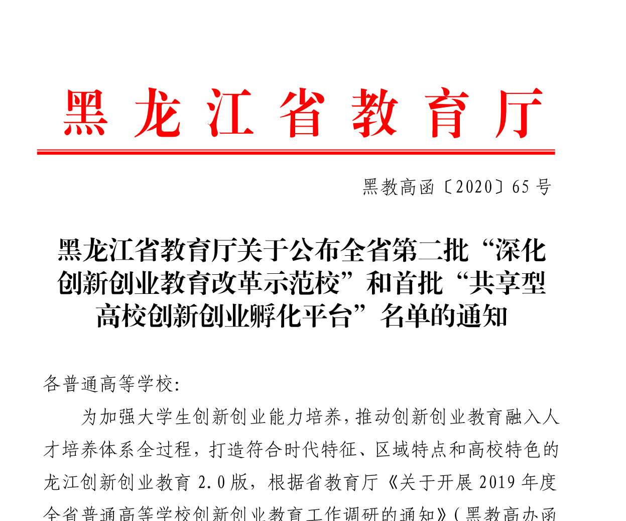 2019年,为加强大学生创新创业能力培养,推动创新创业教育融入人才培养体系全过程,打造符合时代特征、区域特点和高校特色的龙江创新创业教育 2.0 版,省教育厅部署了《关于开展 2019年度全省普通高等学校创新创业教育工作调研的通知》(黑教高办函 〔2019〕132 号)相关工作,LETOU官网积极申报了全省第二批“深化创新创业教育改革示范校”。