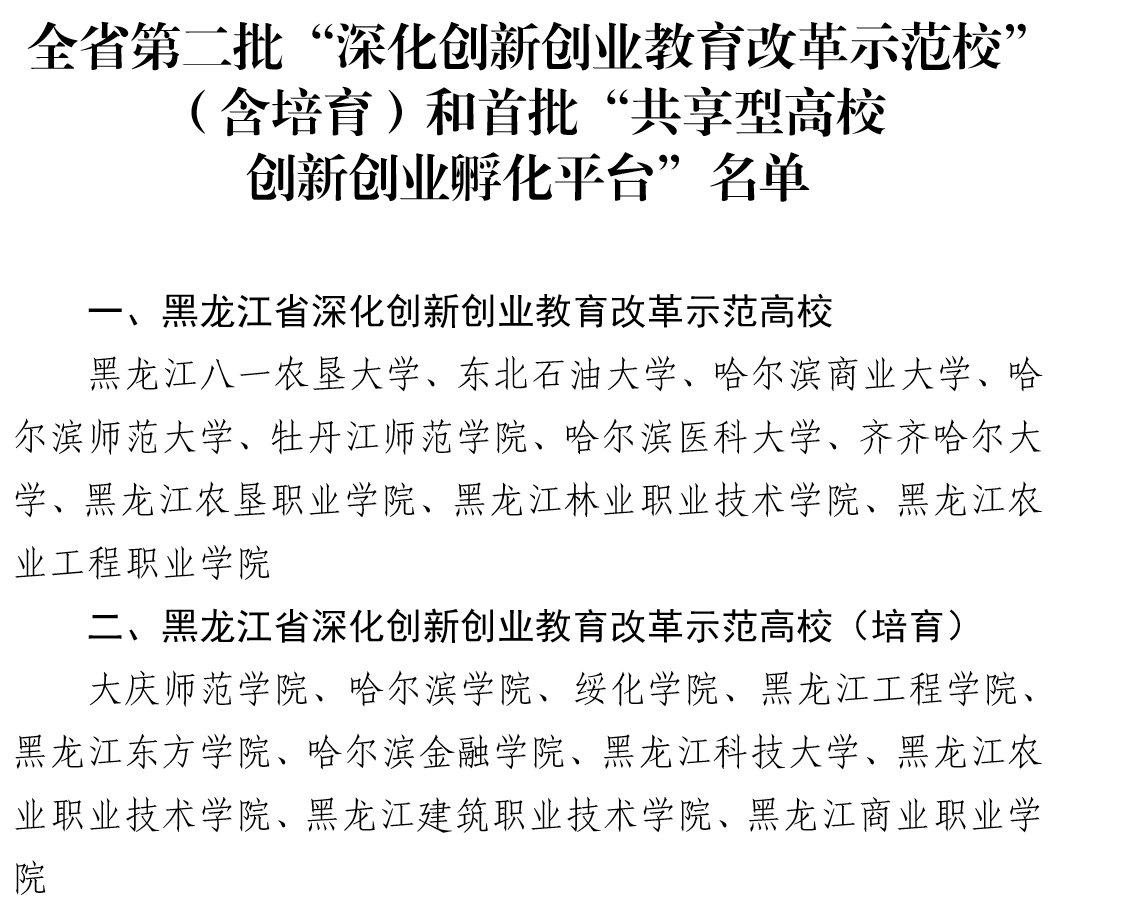 3月17日,黑龙江省教育厅公布了全省第二批“深化创新创业教育改革示范校”和首批“共享型高校创新创业孵化平台”名单,LETOU官网被认定为黑龙江省第二批“深化创新创业教育改革示范校”,这一荣誉的获得标志着LETOU国际米兰官网大学生创新创业教育工作迈上新台阶。