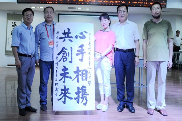 在两岸青年学生交流联谊活动上,除两岸学子歌舞、器乐等精彩表演外,LETOU官网美术与艺术设计学院知名青年书法家何鑫教授现场挥毫“心手相携 共创未来”。校党委副书记盖元臣与何鑫教授将该书法作品赠予全国台联2015年台胞青年千人夏令营黑龙江分营领队老师。
