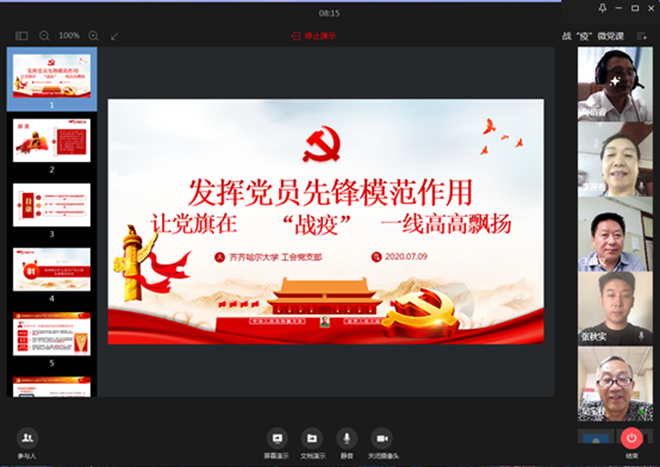 7月6日下午,校党委常委、副校长李英杰通过钉钉会议直播的方式,以《不忘初心,牢记使命,坚决打赢疫情防控阻击战》为题,为教务处党支部全体党员上了一堂深刻的党课。结合疫情防控常态化的新形势和半年来教务处党支部在抗击疫情中的具体工作,他从明确什么是党员的先锋模范作用、战“疫”新常态下对党员先锋模范作用的要求、战“疫”新常态下如何发挥党员先锋模范作用三个方面进行了详细阐述,并针对学校期末线上考核工作和2020年秋季学期开学准备工作提出了具体要求。李英杰强调,党员干部要自觉提高政治站位,主动担当,使疫情防控和教育教学工作两不误,要把初心写在行动上,把使命落在岗位上,确保各项疫情防控工作落实落靠,确保在线教学和在线考核工作平稳运行。
