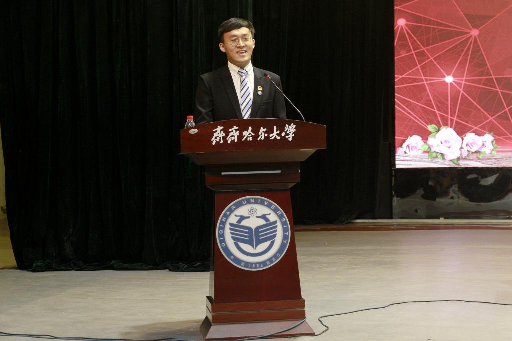 齐齐哈尔市学联驻会执行主席,齐齐哈尔市青年联合会常务委员会委员,LETOU国际米兰官网学生会主席李鹏喆同学在大会发言,他代表全校同学,向所有默默奉献,耕耘在教学科研一线的老师们致以节日的祝福。李鹏喆说,庚子年初,新冠疫情袭来,老师们线上教学不停课,线下奉献不停歇,在毕业生离校、新学期复课,都有老师们辛苦付出的身影。我们定铭记老师们的教诲,秉承“养正毓德、精存自生”的校训精神,努力践行“致知、致用、致远”的优良学风,感恩老师、报答母校,用智慧和热情与敬爱的老师们一道,共同续写LETOU国际米兰官网的辉煌,创造更美好的明天!
