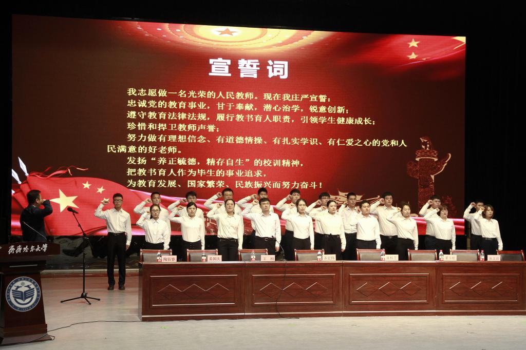 随后,在高教研究中心(教师教学发展中心)主任范晓峰同志带领下,2019年新入职教师代表在大会上进行了庄严的入职宣誓。