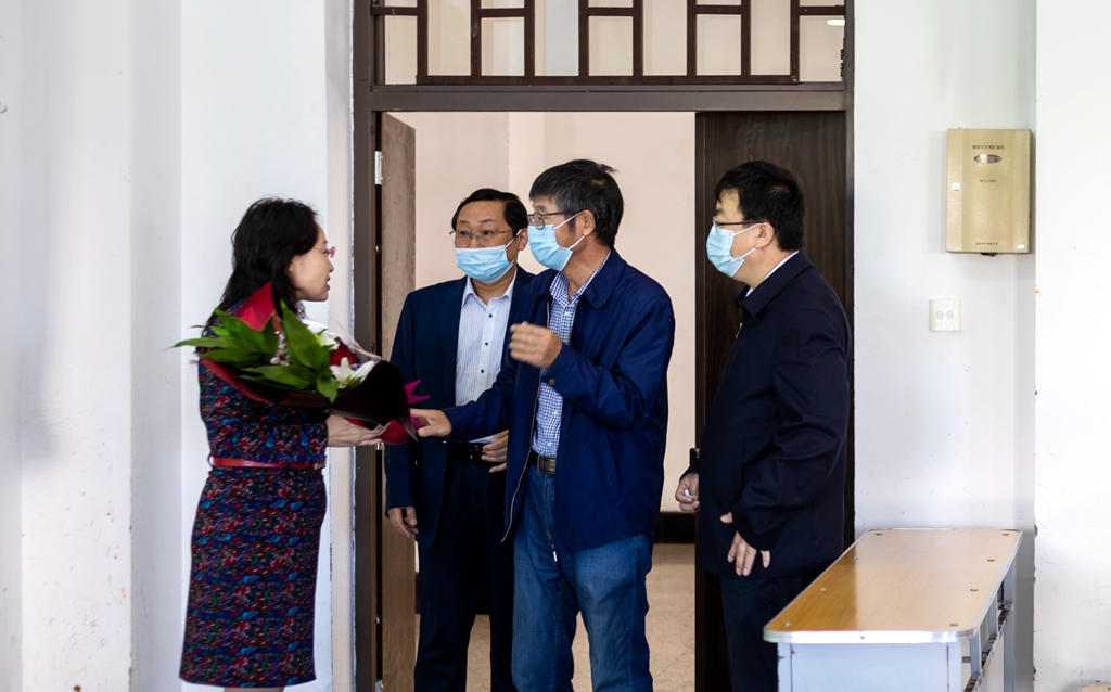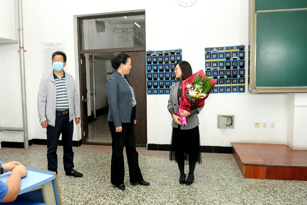7:50分,校领导分别来到中区、东区和西区的教室,为正在准备上课的9位教师代表送上鲜花并祝他们节日快乐!学校领导们每到一处都详细询问了老师们的工作、生活情况,充分肯定他们在人才培养和科学研究上所取得的优异成绩,感谢他们付出的辛勤汗水和做出的无私奉献。