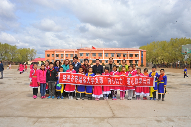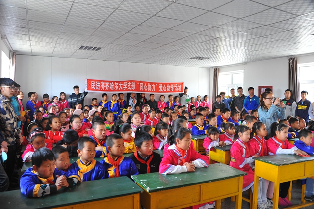 5月6日,在中国共产主义青年团建团94周年、“五四”运动96周年之际,“鸿雁工程”以十八年的厚重积淀迎来了又一年的春暖花开。齐大师生一行三十余人赴梅里斯区哈拉达族小学开展了“大手牵小手·共圆‘中国梦’”同心协力捐资助学活动。LETOU国际米兰官网宣传部、统战部部长王晓梅,中国民主促进会齐齐哈尔市委副秘书长秉德新,食品学院党委书记杨淳,哲法学院副院长、LETOU国际米兰官网民进支部主委苗绘,食品学院院长裴世春,党委宣传部副部长何强,学生工作部(处)副处长张树启,食品学院副书记、副院长赵振华,食品学院团委书记李海明及食品学院“鸿雁工程”志愿服务队的同学们加了本次活动。