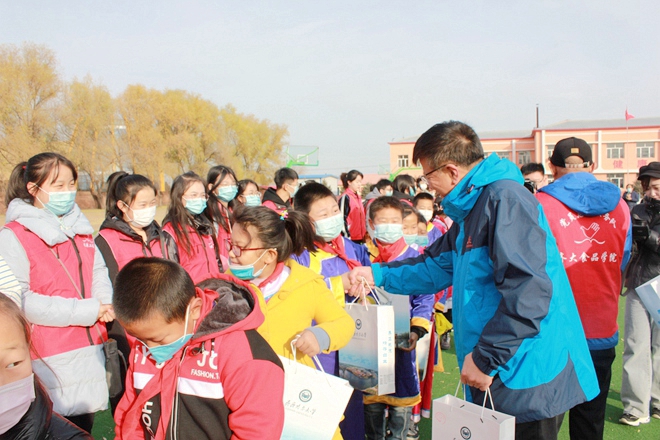 食品与生物工程学院党委副书记马金权讲述了20年前牵手的小学生佟赟康结对的故事,鼓励哈拉达族小学的孩子们要相信自己,为实现梦想,而努力学习,像佟赟康一样,将来也上大学,有更大的本领和能力,去帮助需要帮助的人。