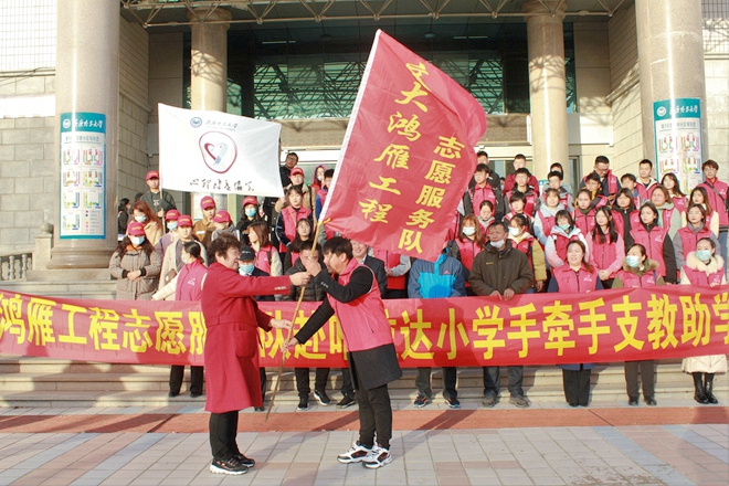 出征前,“鸿雁工程”志愿服务队举行了出征授旗仪式。校党委副书记张文治出席授旗仪式,食品与生物工程学院部分师生、相关职能部门负责人,以及原食品与生物工程学院党委书记杨淳、副书记赵振华参加了仪式。
