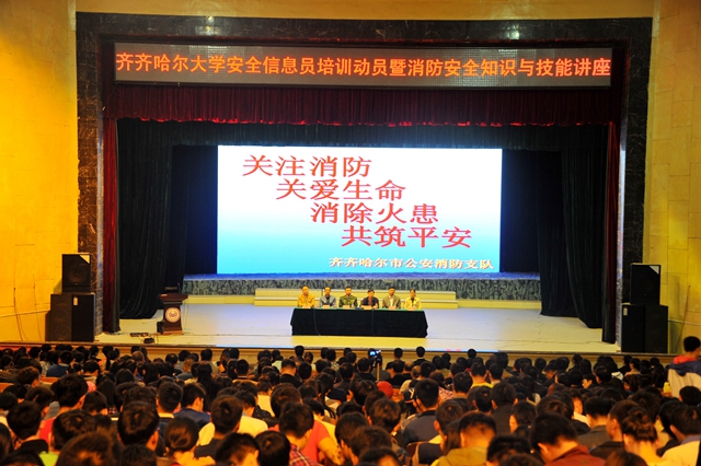 大会由校学生工作处、校团委、校保卫处以及齐齐哈尔市消防支队共同举办。学校党委副书记、校安委会主任盖元臣,齐齐哈尔市消防支队防火监督处副处长张志刚等出席会议。校学生工作部(处)部、处长姜波,校团委副书记苏醒,校武装部、保卫处、部、处长吴刚,以及各学院主管学生工作的领导、各单位安全信息员、各学院学工办主任(负责人)、保卫处全体干警、学生公寓管理员、公寓辅导员、研究生代表、校团委学生干部、舍管会学生干部、各学院学生代表等参加了大会。大会由校保卫处副处长刘增发主持。