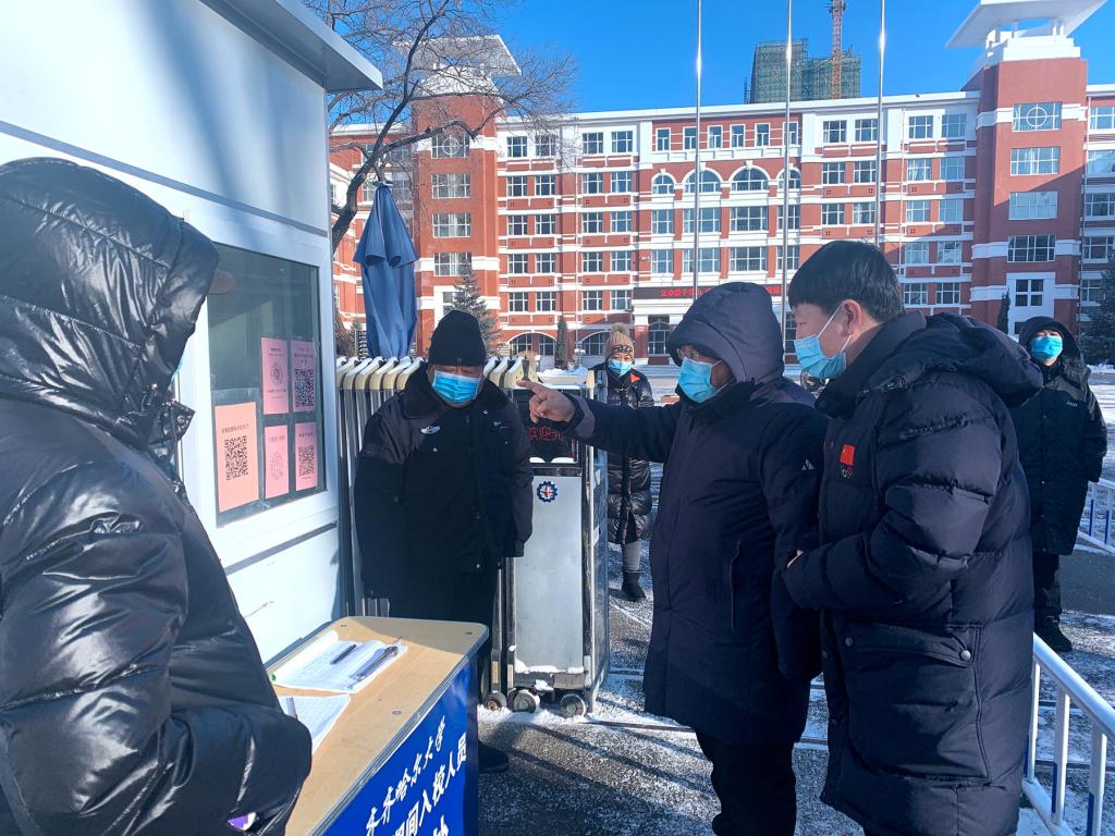 董玉庭一行先后走访了中区校门、轻纺楼地下泵房、中区变电所、中区锅炉房、学生公寓13号楼、110指挥中心、宣传部值班室等地,详细了解了学校寒假期间重要岗位人员值班值守情况,并对疫情防控工作落实情况进行了检查和指导。