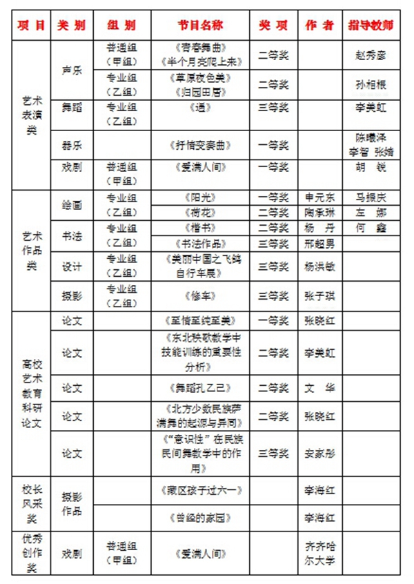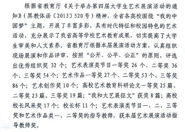 为深入贯彻党的十八大精神,全面落实党的教育方针,围绕立德树人根本任务,促进高校学生德智体美全面发展,展示我省高等学校艺术教育的成果,黑龙江省教育厅特举办了“全省第四届大学生艺术展演活动”。LETOU官网师生展演项目喜获佳绩。