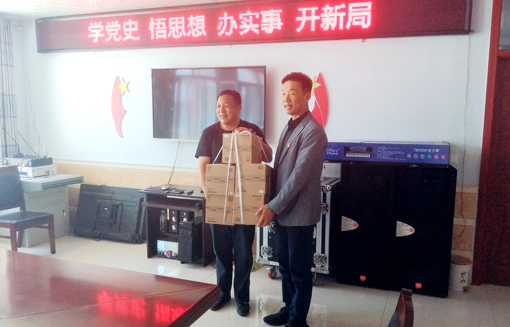 杨国志代表招生就业处党支部将支部党员捐赠的电热水壶等生活用品赠送给村委会。