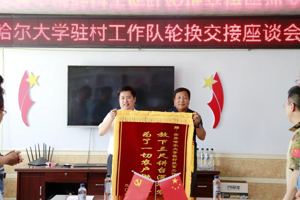 会上,新任工作队员与老队员进行了工作交接,驻村工作队队长秦浩波作了表态发言。永安村党支部书记、村委会主任陈存山代表村民向工作队赠送锦旗,表达了对驻村工作队热心服务村民、真心为民办事的认可和赞扬。