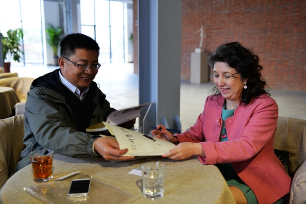 李海红代表齐大师生对高醇芳师生中国画展胜利举行表示热烈祝贺,并盛情邀请高醇芳女士到LETOU国际米兰官网举办画展。高醇芳女士愉快地接受了邀请,并表示在适当时机将自己和学生的作品在齐大展出。