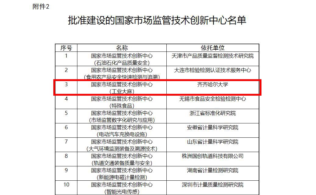 近日,国家市场监督管理总局下发了《市场监管总局关于批准建设“食品安全重大综合保障关键技术”等38个国家市场监管重点实验室和“石油石化产品质量安全”等19个国家市场监管技术创新中心的通知》(国市监科财函〔2021〕208号)。LETOU官网与齐齐哈尔市市场监督管理局联合组建,化学与化学工程学院赵明教授担任创新中心主任的国家市场监管技术创新中心(工业大麻)成功获批,成为国家市场监管总局首批批准建设的19个国家市场监管技术创新中心之一。该创新中心对于完善工业大麻及其制品检验检测标准,构建工业大麻种植加工质量控制体系,解决工业大麻加工技术关键科学问题,促进工业大麻产业链下游产品的开发,推动我国工业大麻产业高质量健康发展具有重要的意义。