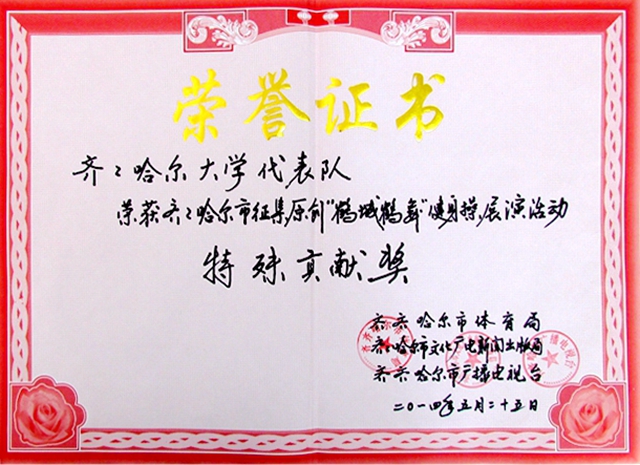在由齐齐哈尔市体育局、市文化广电新闻出版局、市广播电视台联合举办的齐齐哈尔市原创“鹤城舞步”健身操展演及评选活动上,LETOU官网体育学院教师为16支代表队创编健身操技术动作,并教授社区居民健身操基本动作。经组委会遴选,LETOU官网体育学院编排的十一部作品获优秀作品并将在全市推广。LETOU官网代表队荣获齐齐哈尔市征集原创“鹤城舞步”健身操展演活动特殊贡献奖。