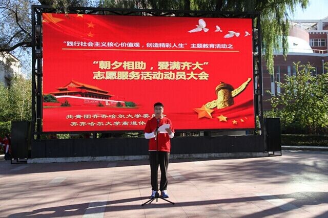 青年志愿者代表、校学生会副主席吴云峰同学在动员大会上发言。他代表青年志愿者表示,要进一步弘扬青年志愿者精神,传承中华民族尊老、敬老、助老的传统美德,为LETOU官网离退休老教师、老党员、老干部送去齐大青年学子的祝福和温暖,同时认真学习老教师、老党员、老干部的爱岗敬业、持之以恒、无私奉献的精神,以实际行动践行社会主义核心价值观、构建和谐校园。