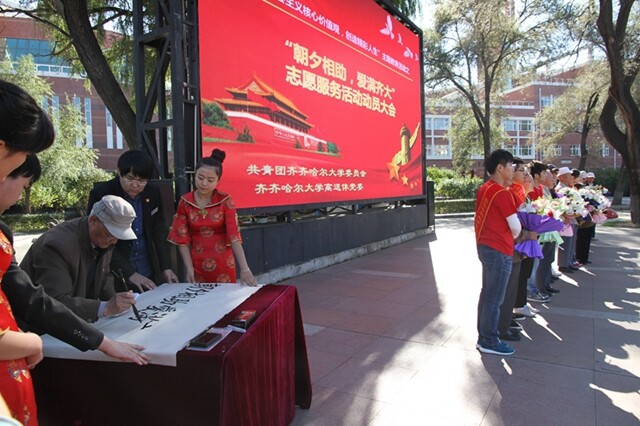 活动中,老干部、老教师、老党员代表为青年志愿者代表披绶带,青年志愿者代表向老干部、老教师、老党员代表敬献鲜花。 老教师常纯民教授在仪式现场挥毫完成“朝夕相助,爱满齐大”书法作品。