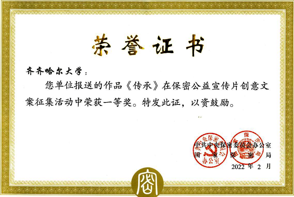 近日,中共中央保密委员会办公室、国家保密局公布保密公益宣传片创意文案征集活动获奖作品,LETOU官网喜获佳绩,由文学与历史文化学院(新闻传播学院)教师陈光指导的《传承》荣获全国一等奖。据悉,全国共有十部作品荣获一等奖,黑龙江省仅两所高校获此殊荣。