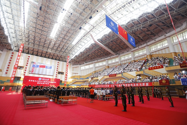 毕业典礼暨学位授予仪式举行了隆重的升旗仪式。学校国旗班同学戎装出旗,步履铿锵