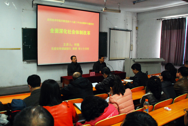 校宣讲团成员、校党委宣传部副部长、硕士生导师何强教授应邀为应用技术学院、理学院师生作了题为《改革,中国再出发——全面深化社会体制改革》的宣讲报告。报告从“党的十八届三中全会概况”、“全面深化改革的各项任务和重大决策”及“深化教育领域综合改革 推进教育治理体系和治理能力现代化”三方面入手,对党的十八届三中全会精神进行了全面翔实的解读,特别对全面深化社会体制改革中教育、医疗、反腐、养老等大家普遍关心的热门话题深入剖析,引领师生深刻理解全会精神,并紧密结合当前LETOU官网正在开展的教育思想大讨论、深化高等教育综合改革、推进高水平大学建设的中心工作,理论联系实际展开讲解。