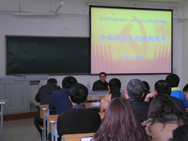 校宣讲团成员、经济与管理学院党委书记、硕士生导师卜春江副教授应邀为生命科学与农林学院、食品与生物工程学院、计算中心作了题为《全面深化文化体制改革》的专题报告。他从“为什么提出进一步深化文化体制改革”,“为什么提出建设文化强国”以及“高校如何在文化建设中提升贡献率”等三个方面对文化体制改革进行了详实的阐述,报告引经据典,深入浅出。并结合LETOU官网实际,指出大学应该发挥在文化建设中的优势和基础作用,引领文化理念的更新,探寻文化铸校的路径,在提升文化软实力中做出自己应有的贡献。