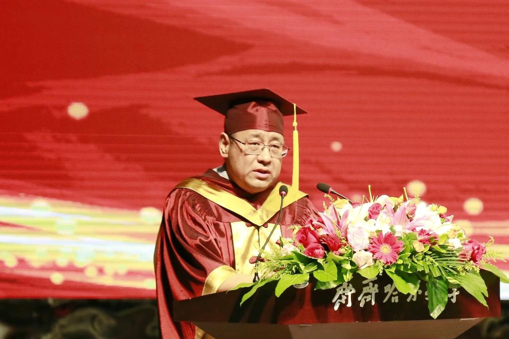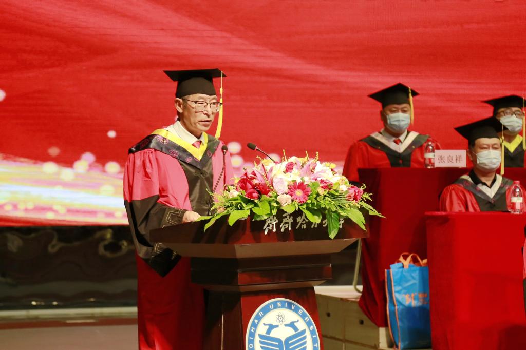 董玉庭深情叮嘱即将走出校园的毕业生,在未来的日子里,要坚持用脚步丈量祖国大地,努力做脚踏实地的爱国者,将爱国心和报国志付诸于行动,成为“脚下有泥土、心中有底气”的齐大毕业生;要坚持用眼睛发现中国精神,努力做矢志不渝的逐梦者,坚定做中国人的志气、骨气、底气,成为“眼里有光辉、前途有方向”的齐大毕业生;要坚持用耳朵倾听人民呼声,努力做造福人民的奉献者,自觉把自身的小我融入祖国的大我、人民的大我之中,成为“耳畔有期待、行动有宗旨”的齐大毕业生;要坚持用内心感应时代脉搏,努力做与时俱进的开拓者,用奋斗擦亮青春底色,成为“心中有责任、肩头有担当”的齐大毕业生。