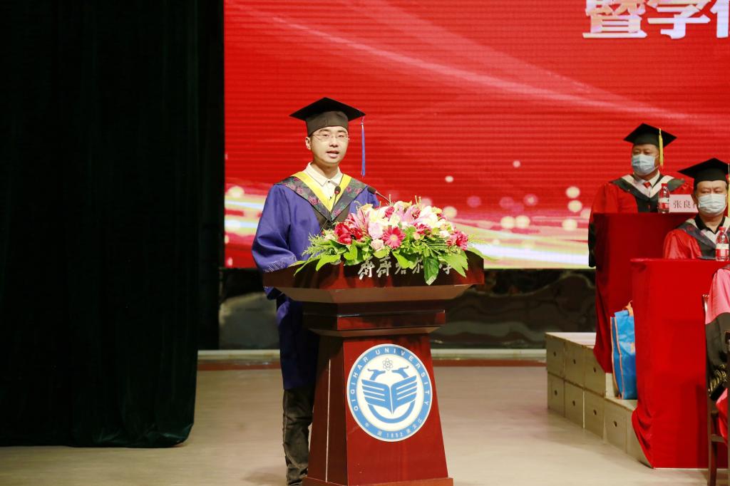 研究生毕业生代表、化学与化学工程学院工业催化专业、成功考入青岛大学攻读博士学位的骆泽同学在发言时,深情地表达了对母校的感恩和不舍,对老师、同学的感激和祝福,并表示,作为齐大学子,一定会秉承“养正毓德 精存自生”的校训精神,积极进取、努力拼搏,用自己的所学所能回馈社会、回报母校。