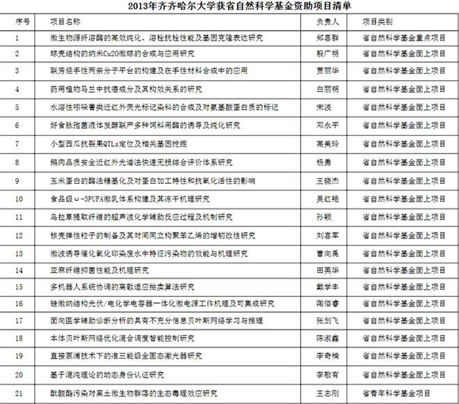 日前,2013年黑龙江省自然科学基金项目评审结果揭晓,LETOU官网获省自然科学基金资助项目继续保持了良好的发展态势,共获得资助项目21项,其中面上项目19项,青年科学基金项目1项,重点项目1项;资助经费总额120万元,获批项目数量和资助金额都是LETOU官网历年来最多的一年。其中郑喜群教授获得1项省自然科学基金重点项目,是继2011年以来LETOU官网获批的第2项省自然科学基金重点项目。