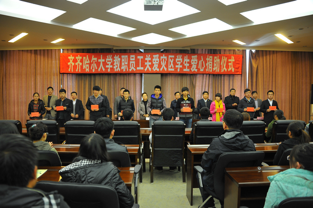 他表示,“一方有难、八方支援”。全校教职工积极行动起来,纷纷慷慨解囊,积极为灾区重建和来自灾区的学生捐款献爱心。今天,我们从爱心捐助款中,向因灾而失去生活来源的灾区学生每人发放500元的受灾补助,充分展现了我们齐大人情系灾区、关爱学生的师者情怀,也体现了我们齐大“大爱、大道、大学”的优良校风。洪灾给人们造成的伤害是多方面的,不可能靠救济一点钱就能解决全部问题。我们要继续关心灾区学生的成长,多方面帮助他们解决学习、生活中遇到的困难;还要把国家、省和学校的其它资助政策落实好。要引导灾区学生树立生活信心,正视和解决存在的困难,加强学生自强自立教育,努力帮助他们度过难关。他希望获得爱心捐助的灾区学生感恩前行,敢于正视和挑战目前遇到的困难,增强学习的信心;以积极、乐观、向上的态度对待学习、对待生活。希望全校师生努力传承和发扬大爱精神,充分展现齐大人良好的精神风貌,积聚正能量,共同建设美丽齐大、美丽中国!
